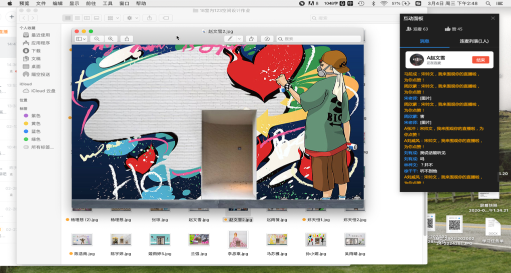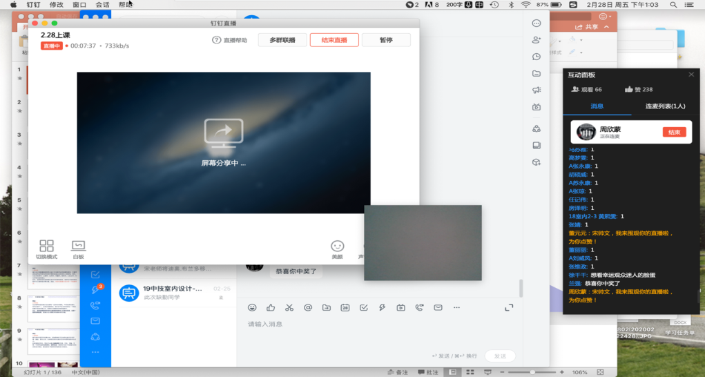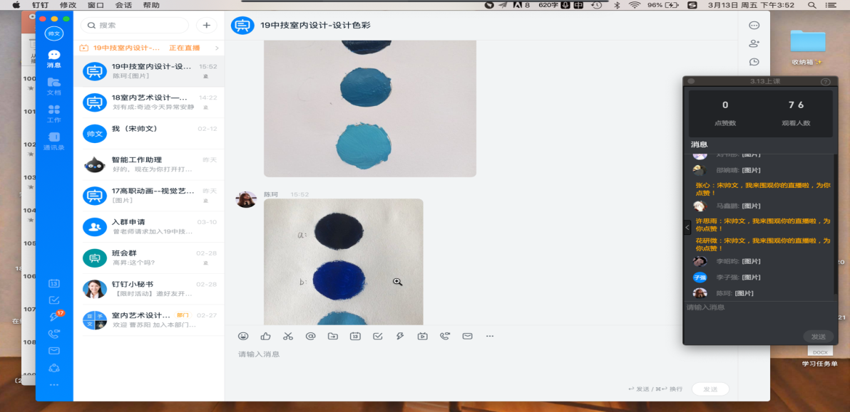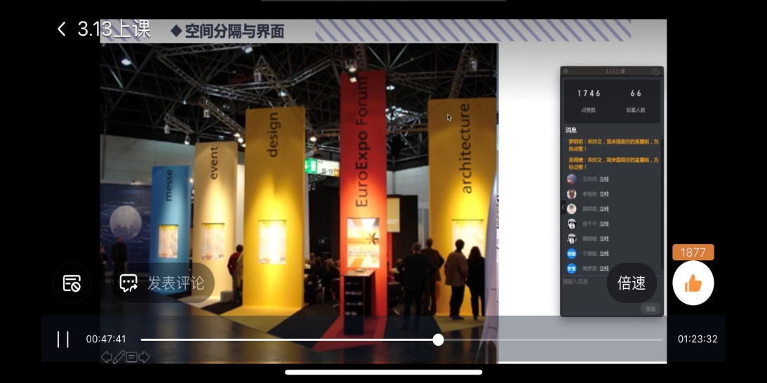 这样连麦的形式同样适用于作业的反馈,18室内艺术设计123班的同学每周有一个大作业,宋老师会在下一周的课堂上邀请员工在线阐述自己的设计方案,通过两周的作业汇总可以看出这种公开点展示的方式,更能促使员工更认真的完成作业。