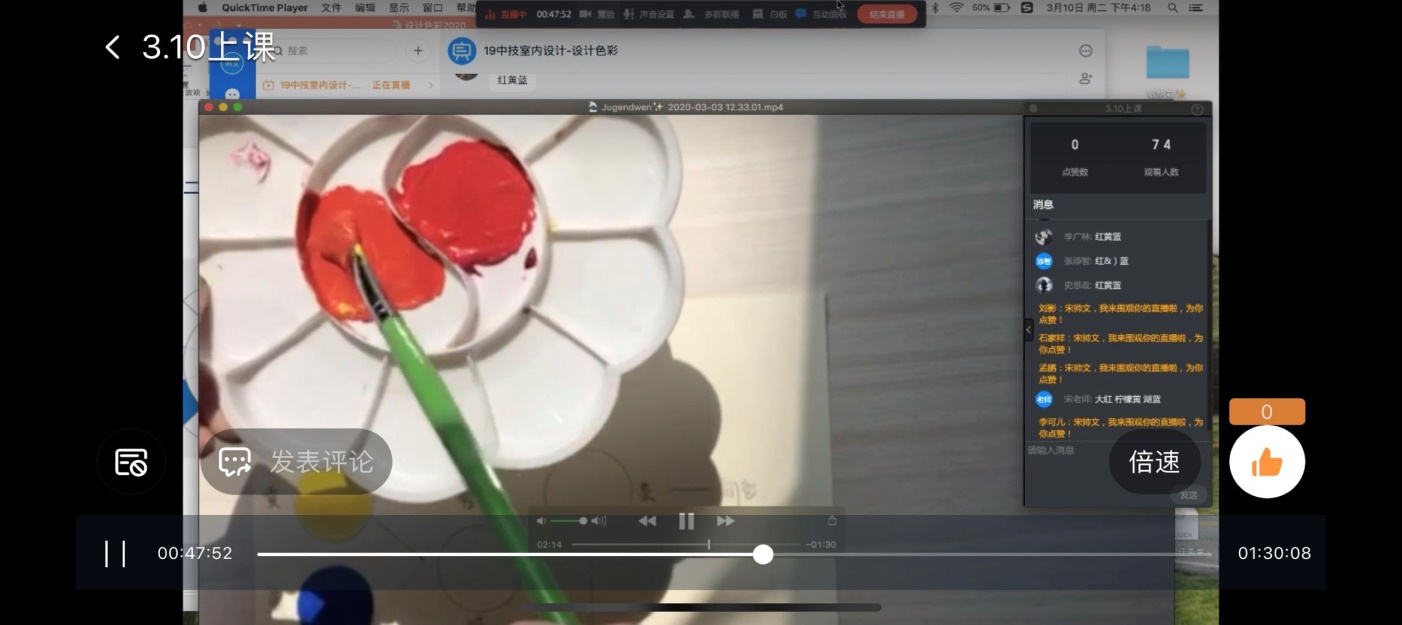 《设计色彩》是19员工的专业课程,1年级员工在此之前从来没有接触过色彩的相关知识,这为线上开展实践环节带来了很大的挑战,宋老师为了让员工更好的理解实践的步骤,在直播中播放提前录制好的绘画步骤的视频,一步步的进行指导,同时为了员工对课程的兴趣,也通过屏幕模仿主播经典手势,与同学们互动。这样的形式很好的保障了课堂实践环节的实施。