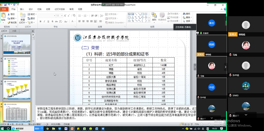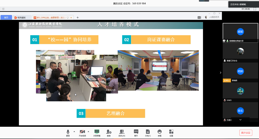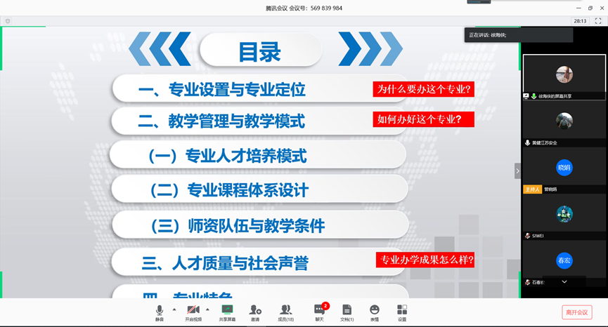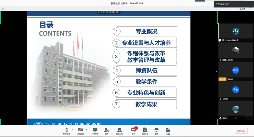 为提升学院专业建设能力,保证学院办学质量, 3月28日晚7:30开始,信息工程系通过腾讯会议组织信息安全与管理、电子商务、室内艺术设计、云计算技术与应用、幼儿发展与健康管理五个专业进行线上专业剖析汇报。系部领导吴德平书记、黄健主任、曾晓娟副主任、五个专业剖析团队成员参加了本次剖析会,由黄健主任主持。石春宏、徐海侠、薛珺予、袁思维、殷媛媛五位老师分别代表五个团队进行剖析。每位汇报人从专业设置与人才培养模式、教学条件保障、教学管理与教学模式、人才质量与社会声誉、专业特色、存在问题与措施等方面进行介绍。将专业团队对为什么办这个专业、如何办好这个专业、专业办学成果剖析的较为透彻。系部领导也针对每一个团队的剖析报告不足的地方,提出了整改的建议。希望每个团队要立足于专业建业做深刻分析,从专业论证到专业发展,取得的初步成果,突出专业建设的优势,展示专业亮点。从汇报讲解到PPT制作、讲稿的细节要努力做到精致与细节都不忽视。为时两个半小时的汇报与交流,让剖析团队进一步理清了思路,为下一步的剖析改进工作提供了很好的帮助。