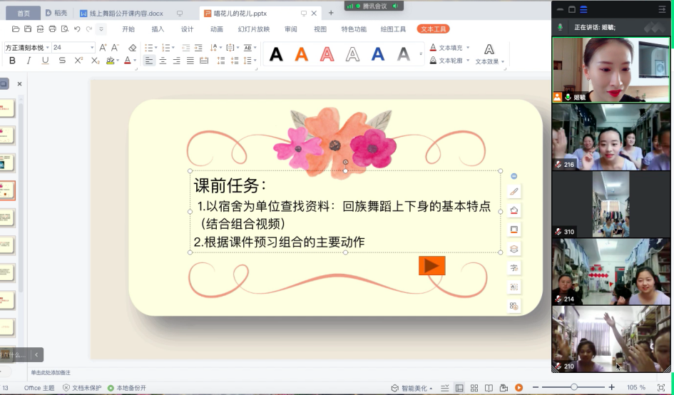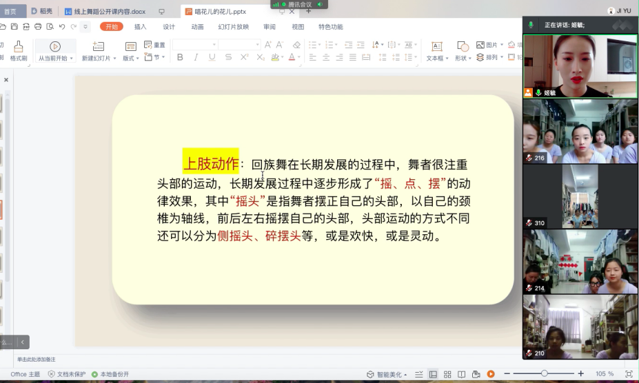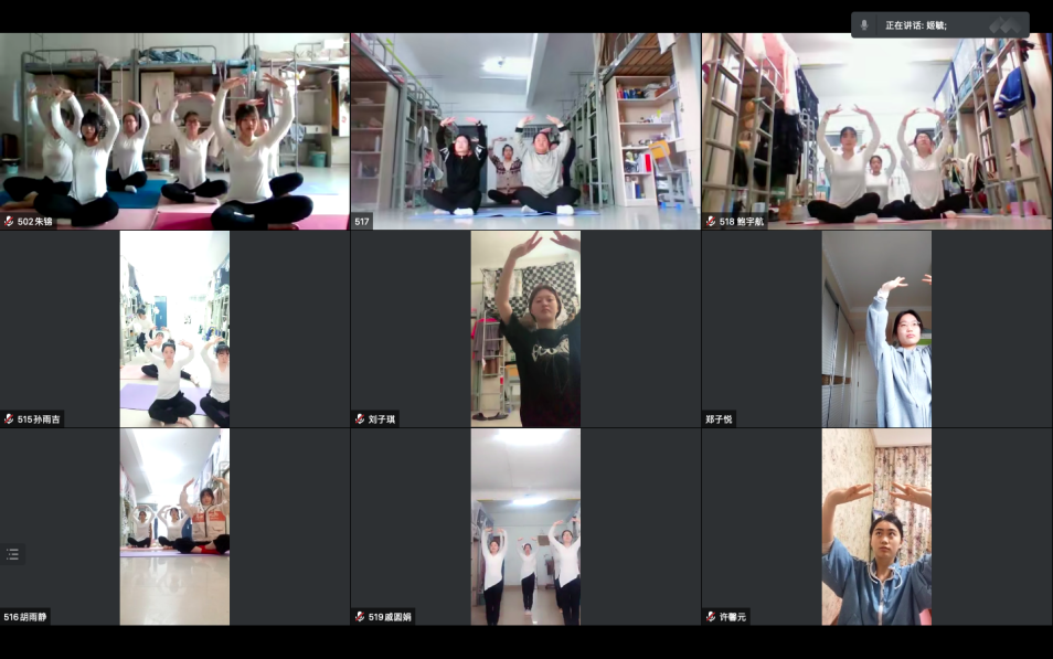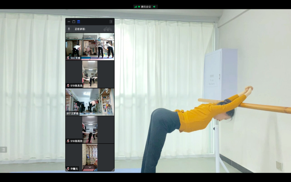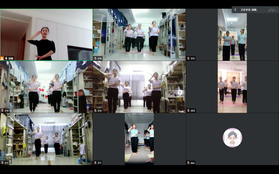 战胜疫情最重要的是免疫力,而舞蹈是非常好的提高免疫力的运动方方式,同学们在大量的网课理论学习期间,多参与舞蹈这样的实践课程,能缓解学习的压力、调适心情,又能够锻炼身体、增强免疫力。常规的舞蹈课程中,师生一起在宽敞明亮的舞蹈教室,随着音乐翩翩起舞,师生面对面看的很清楚,教师当面示范,言传身教,及时指导员工的动作问题,而此刻需要在网络中隔着屏幕实现,宿舍空间的大小、网络的流畅度等都影响着课程质量。怎样保证线上课程教学效果不打折扣?怎样让课堂的互动加强,让每一个员工能够动起来?通过以往的线上课程摸索和实践情况来看,腾讯会议软件实时线上教学能够很好的满足该课程的标准化教学与实践教学活动的综合要求。为此,姬毓老师根据教学需要,自己录制剪辑示范教学视频,采用腾讯会议直播、智慧职教平台辅助完成线上教学。